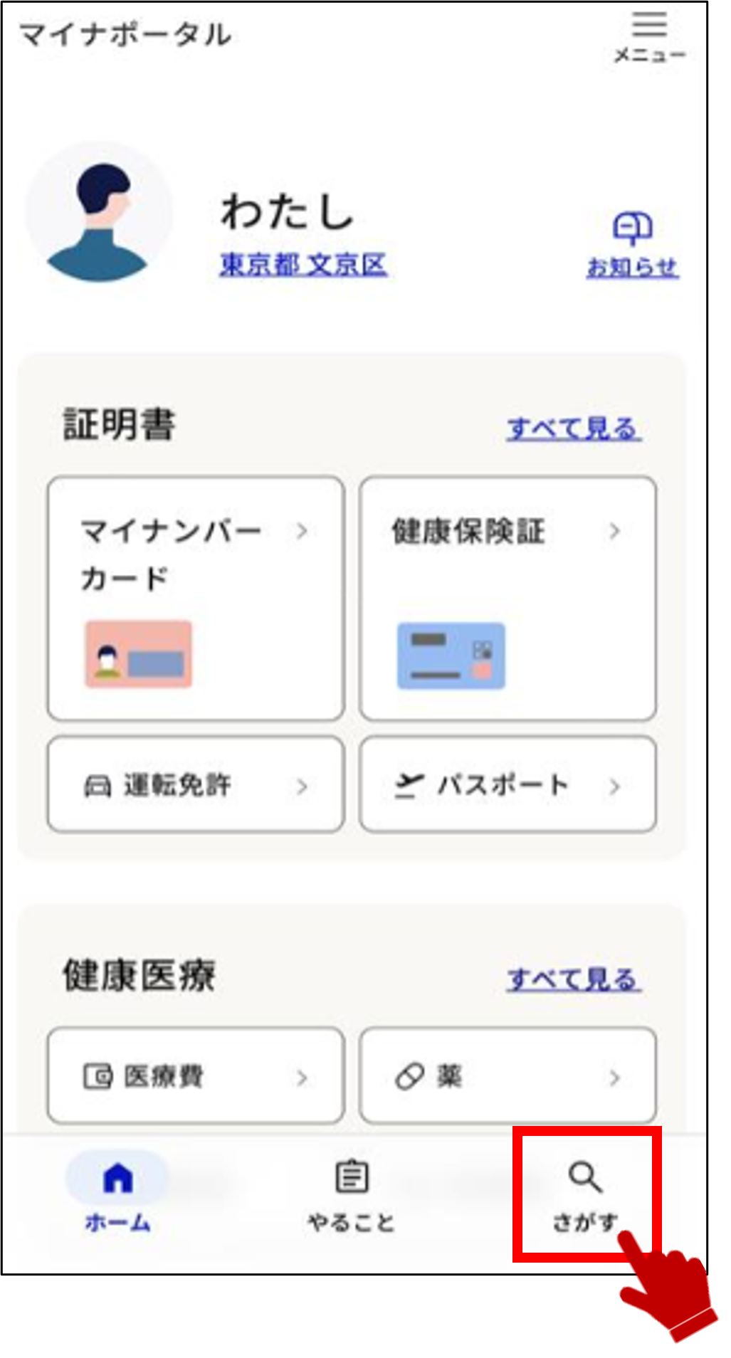 > 1: トップページから、さがすを選択する