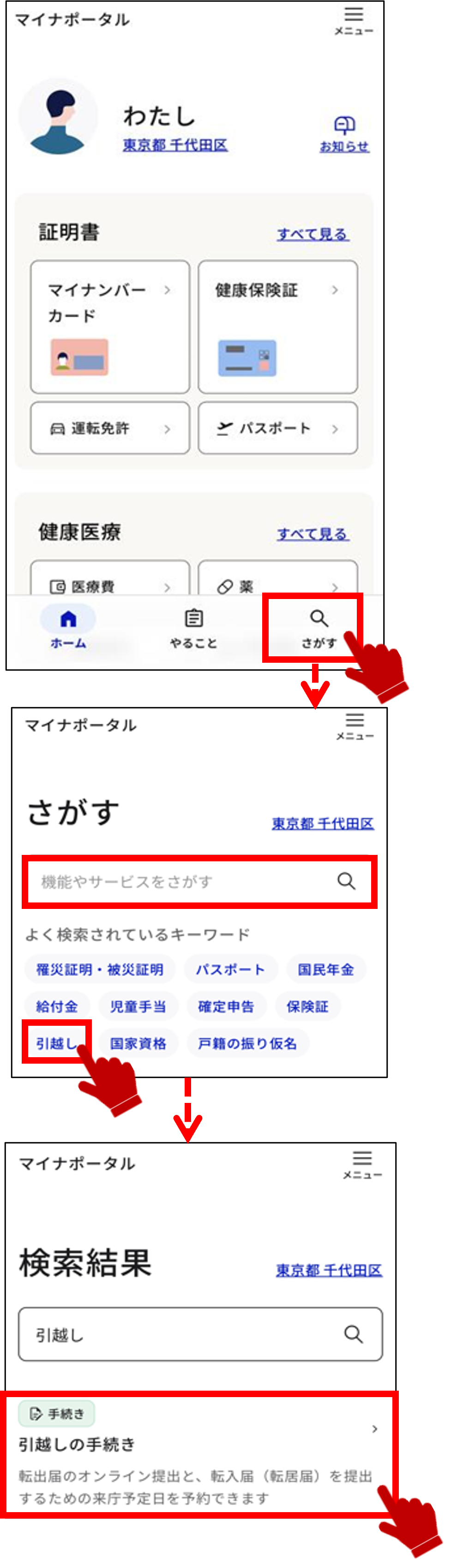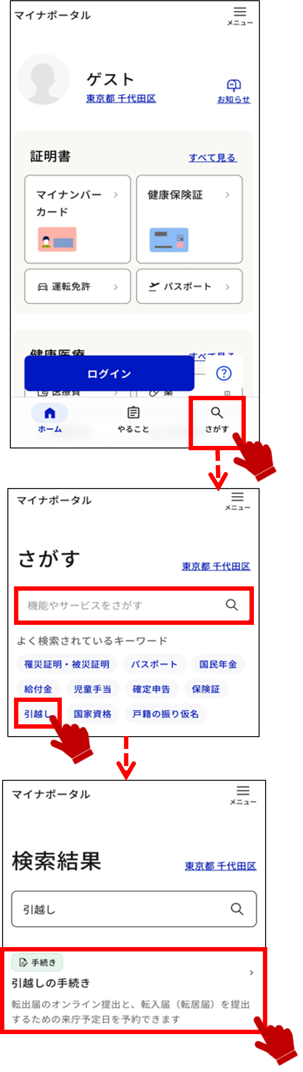 ログイン前トップページ下部のさがすで引越し手続を検索し、手続詳細を表示します。