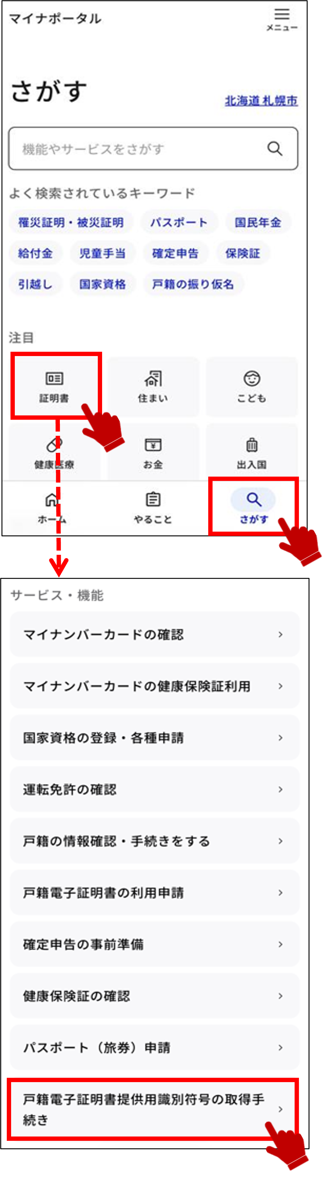 ログイン後トップページ下部のさがすで証明書を押下します。
