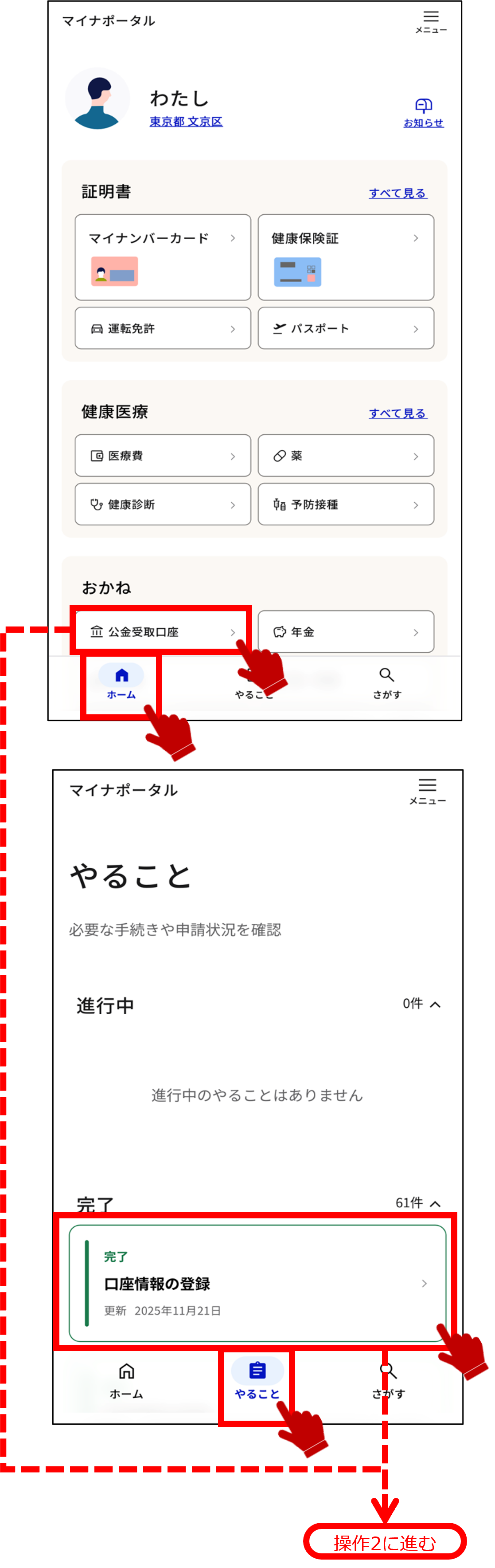 トップページホームタブのおかねエリア内の公金受取口座、またはやることタブの口座情報の登録を選択します。