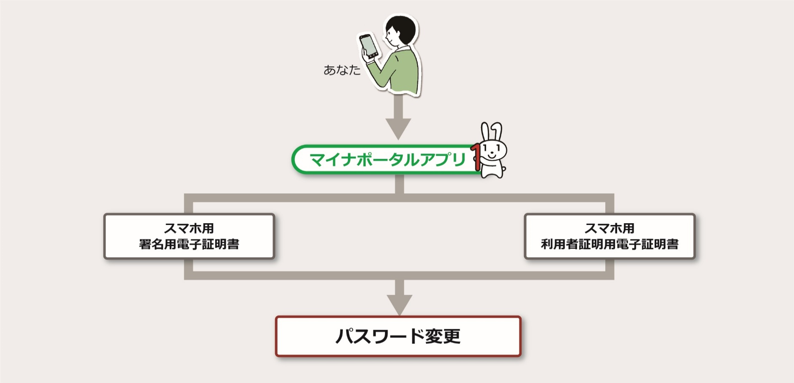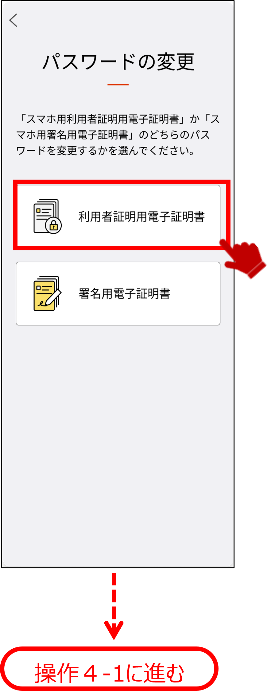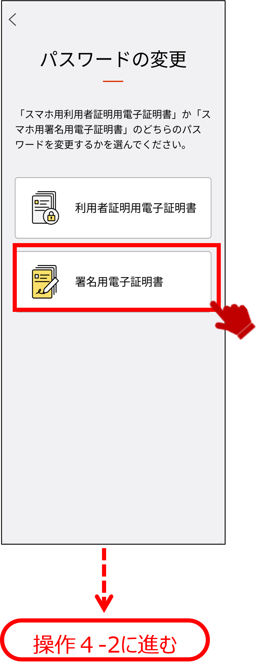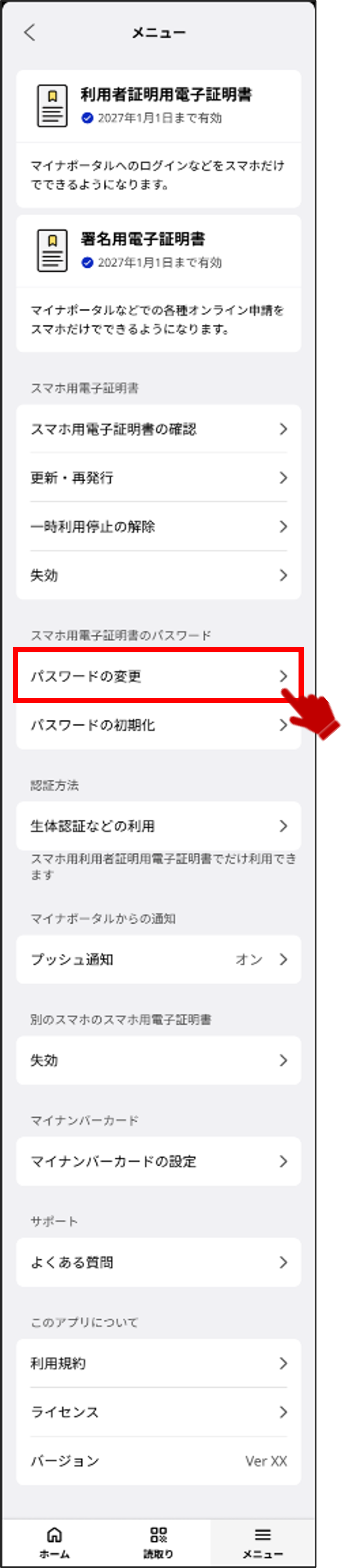 スマホ用電子証明書のパスワードを変更する操作を説明します。